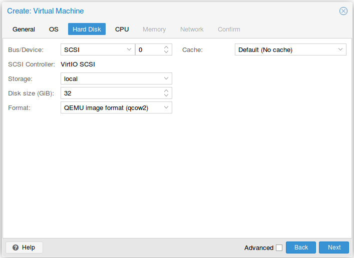 In Hard Disk tab, keep the default qcow2 device with VirtIO SCSI storage and