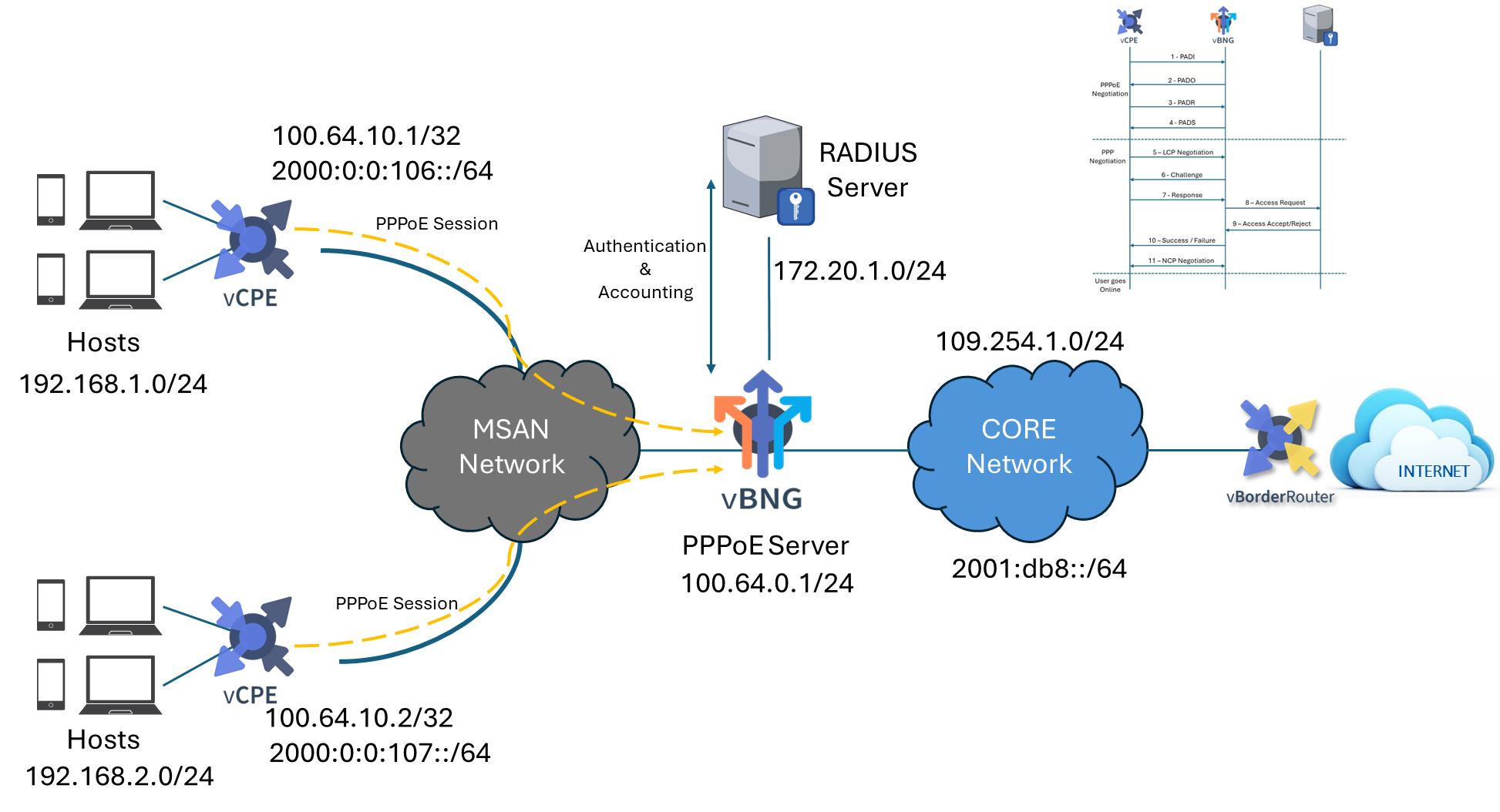 The following diagram shows the architecture that has been deployed for the BNG PPPoE dual stack use case.